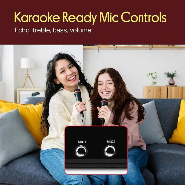 INDEPENDENT MAIN CONTROL - Features a Main control knob that enables access to Volume, Treble, Bass and Echo effect. (2) 1/4 inch microphone inputs let you Karaoke as a duet. Level up your living room today