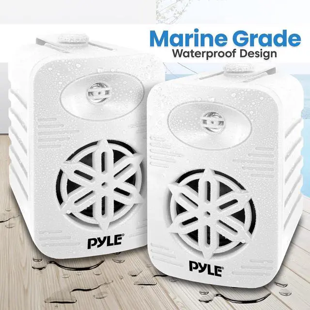 WATERPROOF CONSTRUCTION: speakers outdoors are made with heavy-duty ABS construction and are marine-grade waterproof making them safe to use in places w/ heavy water splashes. Excellent for use on boats/ marine/ decks/ patios/ poolside/ outdoors