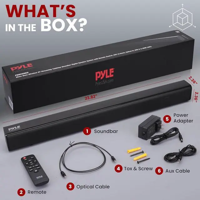 Introducing the Pyle Wave Base Wireless BT Streaming Tabletop Soundbar Digital Speaker System with Remote Control, AUX (3.5mm), Optical In, USB In & HDMI (ARC). Designed to sit under your television, this powerful and compact soundbar system enhances your home theater experience with full-range stereo sound and extended bass performance. Built-in Bluetooth allows for instant wireless music streaming from all your favorite Bluetooth-enabled devices, including smartphone, MP3 player, tablet, and PC. This versatile sound system features digital optical audio connector jacks, a USB port, HDMI ARC, and an AUX input, making it compatible with a wide range of devices. The system doubles as a TV speaker base entertainment system, with a ported tube design ensuring superior audio performance. Convenient source selection with LED indicators and an easy touch button audio select control center make operation simple and user-friendly. Easy to use and set up, the Pyle Wave Base Soundbar comes with everything you need, including audio connection cables, a remote control, an optical cable, and a power adapter. Technical specs include an RMS power output of 30 watts (15 x 2), Bluetooth 5.0 with a 50-foot range, and a 4-ohm speaker impedance. The soundbar measures 23.82'' x 2.36'' x 2.36'' and weighs 2.74 lbs. Enjoy enhanced sound quality and versatile connectivity with the Pyle Wave Base Wireless BT Streaming Tabletop Soundbar.
