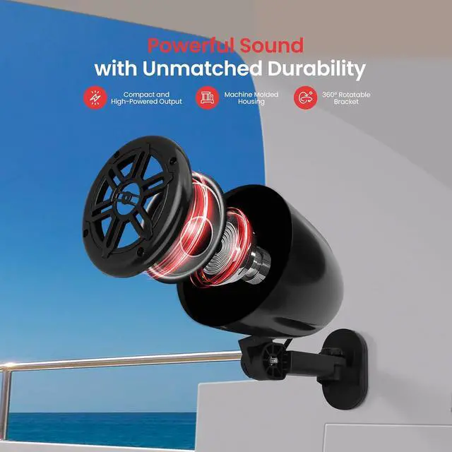 360° ADJUSTABLE MOUNTING BRACKET Easily position your boat speakers with the included 360° rotatable brackets. Adjust the angle for the best sound projection, ensuring optimal coverage in any setup, whether on land or water.