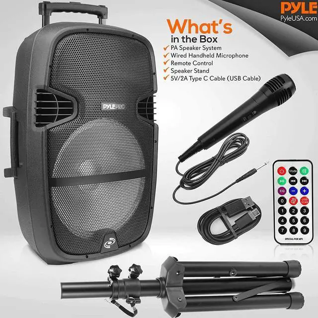RECHARGEABLE BATTERY: These Pyle PA wireless speakers with bluetooth are great for karaoke, stage performances, & crowd control. It is fully portable w/ a built-in rechargeable battery, rolling wheels, & handle so you can take it anywhere you go