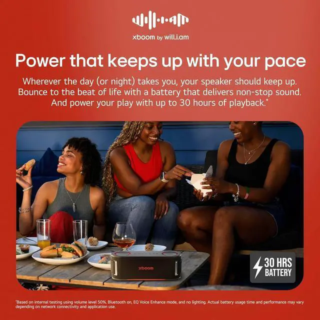Sound and style collide to deliver an all day, all night powerful audio punch. xboom Bounce redefines your audio experience with vibrant sound tuned by LG's Experiential Architect, will.i.am. ¹Passed 7 different MIL-STD 810H Tests for durability conducted by an independent laboratory in U.S. that conforms to U.S. military standards (December 2024). Compliant with the following methods for MIL-STD-810H: Method 506.6 Rain (Procedure III Drip); Method 501.7 High Temperature (Procedure II Operation); Method 516.8 Shock (Procedure I Functional Shock); Method 512.6 Immersion (Procedure I Immersion); Method 509.7 Salt Fog; Method 510.7 Blowing Dust (Procedure I Blowing Dust); Method 514.8, Category 4 Vibration. Device may not perform as tested in all conditions. Test performed in controlled environment. Do not attempt.