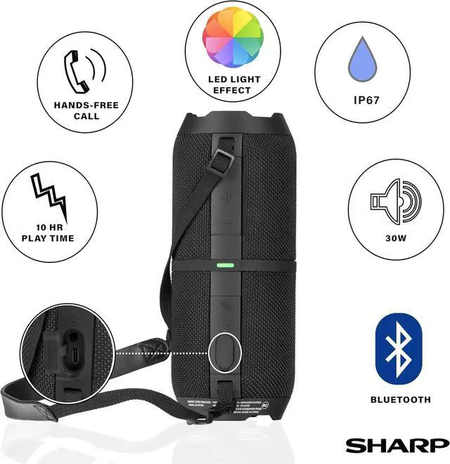 This Sharp GX-BT390 Crystal Clear Series Portable Bluetooth Speaker features Waterproof IP67 | 10 Hour Playtime | 2 LED Light Modes | 60W Max Power with Strong Bass | True Wireless Stereo Pairing | Built in Mic for Hands-Free Calling | Strap | Comes in a Stunning Black