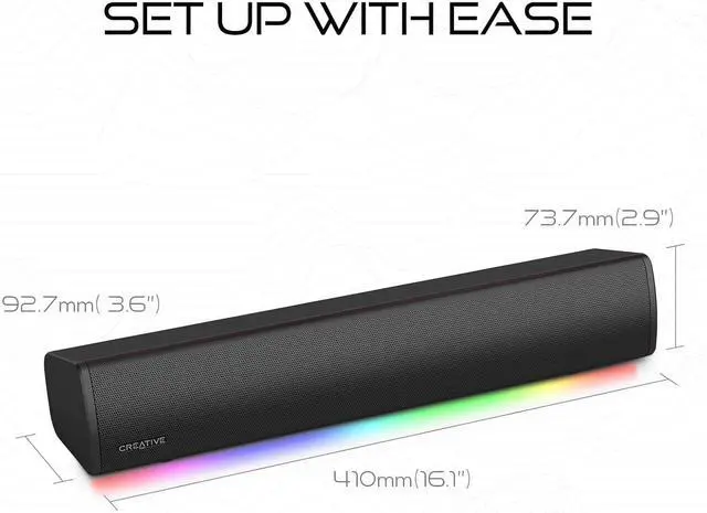 A single USB-C cable* is all you need to bring the Sound Blaster GS3 to life. Delivering both audio and power, reduce any cable clutter, with easy-to-reach buttons and volume control knob on the right side of the soundbar.
