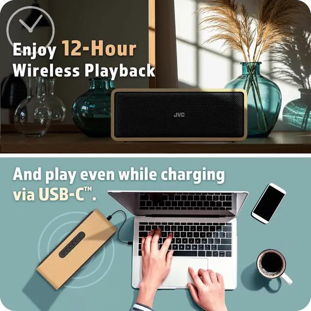 RICH, NATURAL STEREO SOUND ANYWHERE: Enjoy full-range, vibrant sound from a compact speaker crafted with genuine wood. Whether relaxing at home, focusing at work, or setting the mood at a picnic, this palm-sized JVC speaker delivers immersive audio anywhere life takes you.