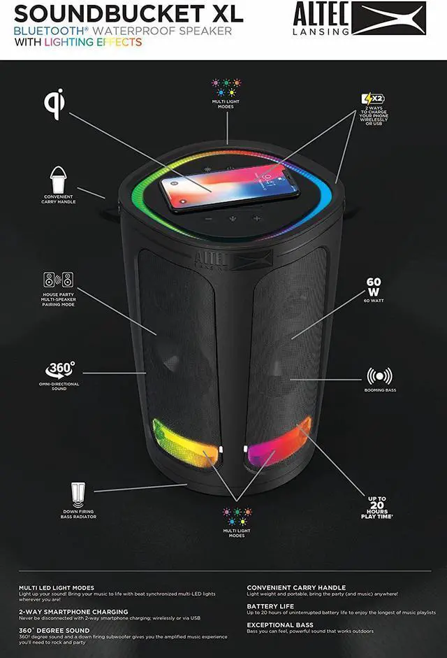 SATISFACTION : Altec Lansing prides itself on providing high quality outdoor speakers and portable sound systems. However, if you are unsatisfied with your purchase for any reason, just send us a message and well take care of you! Whether you need a speaker bluetooth users can enjoy anywhere or outdoor bluetooth speakers waterproof users can take to the pool, the Altec Lansing SoundBucket XL keeps your favorite songs playing day or night, rain or shine!