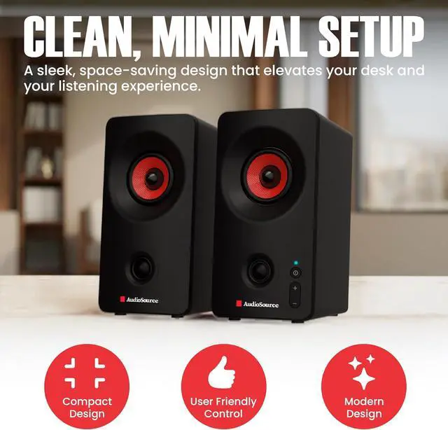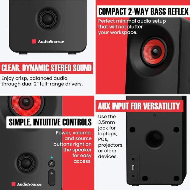 Compact Size, Clean Design Designed to fit any desk setup, these PC speakers feature a sleek matte black or white finish, simple LED indicator, and intuitive power and volume controls. At just 3.5" x 6.6" x 3.9", they blend into your workspace while elevating your sound.