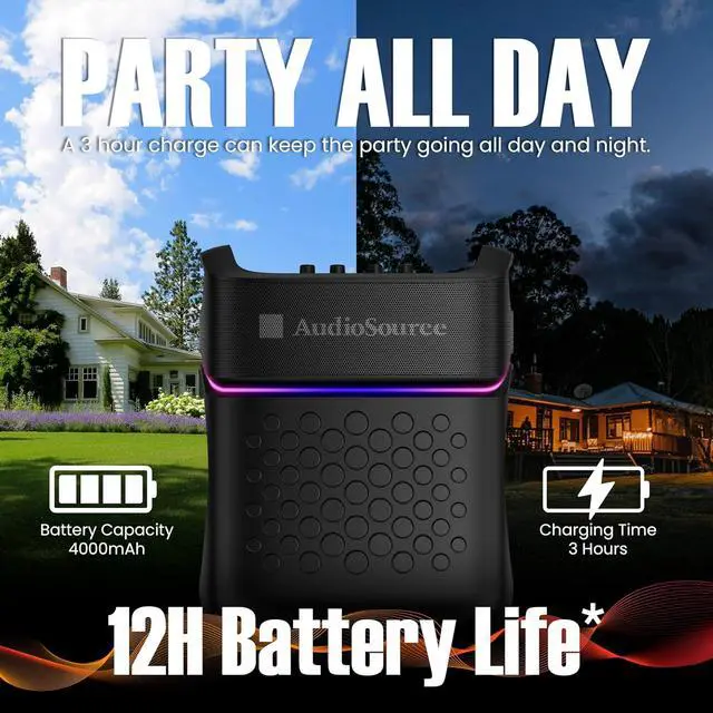 Rechargeable 4000mAh Battery & Ultra Bass Mode Keep the music going for up to 12 hours of continuous playtime on a single charge (at 50% volume). Activate Ultra Bass mode for an instant low-end kick, and enjoy multiple input options with USB, AUX, and TWS/Party Link support.