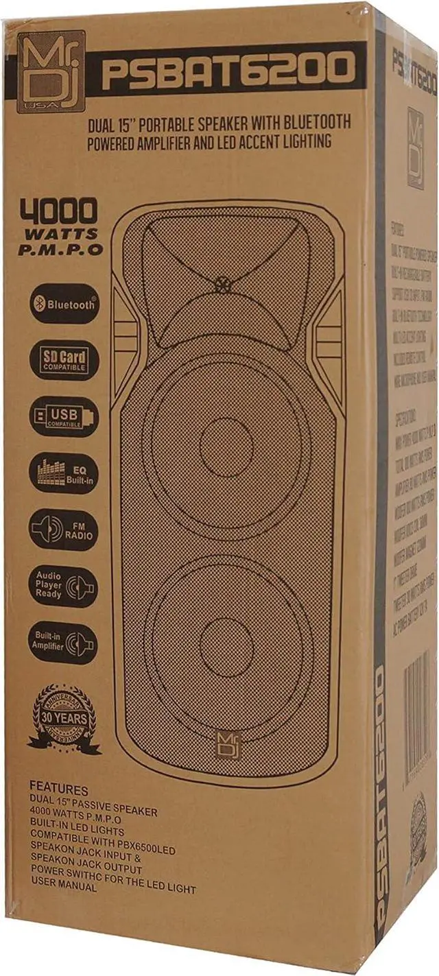 Woofer 2 x 15" Voice Coil 2" Magnet 33 Oz, Max Power 4000 Watts P.M.P.O RMS Power 200 Watts, Amplifier Type Class AB, Tweeter 1" Crossover 3KHz/12db PTC Driver Protect