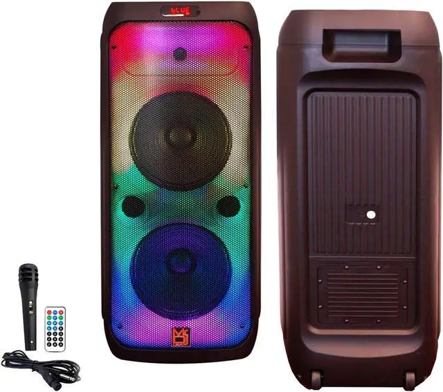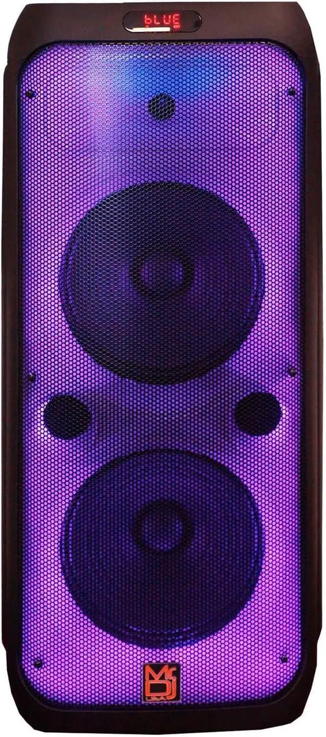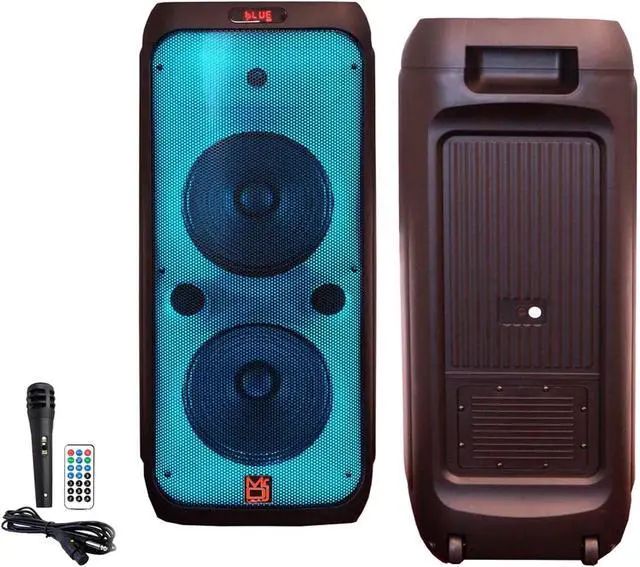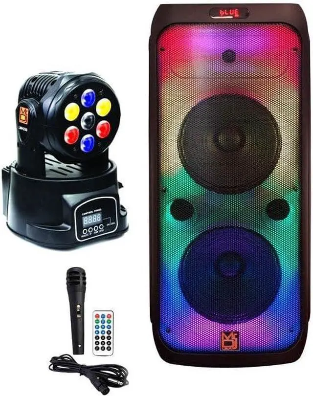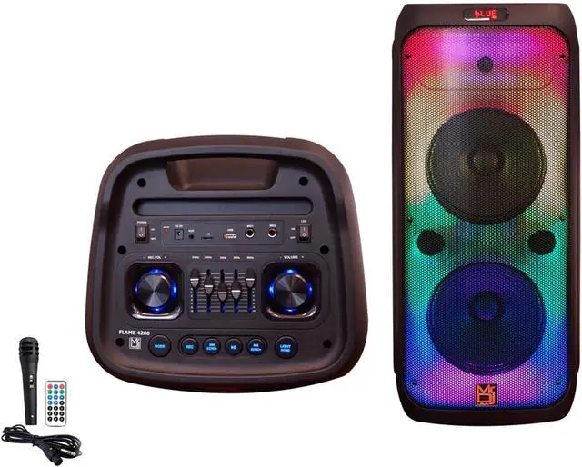 • MR DJ USA FLAME4200 10" X 2 Rechargeable Portable Bluetooth Karaoke Speaker with Party Flame Lights Microphone TWS USB FM Radio + 7-LED Moving Head DJ Light