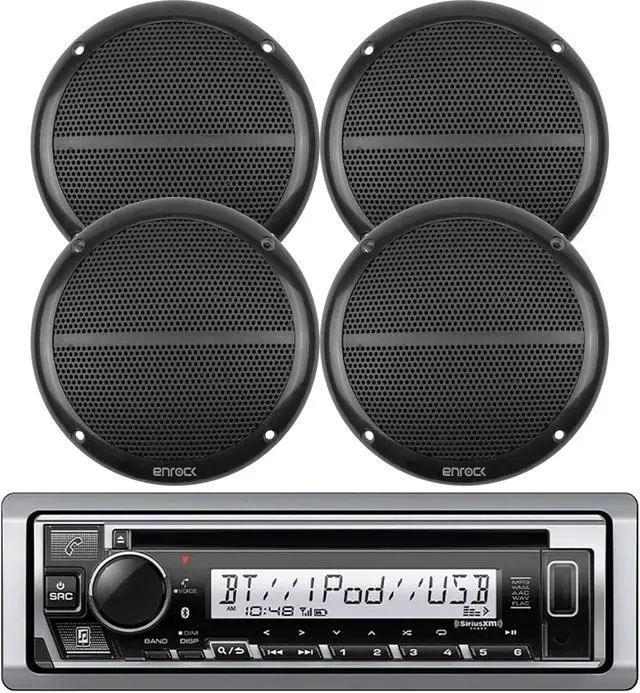 PACKAGE INCLUDES: 1 X Single DIN Bluetooth In-Dash CD Player AM/FM Marine Stereo Receiver, 4 X Enrock EM602B Marine 2-Way 6.5 Inch Weather Resistant Full Range Black Speakers 90 Watts Peak