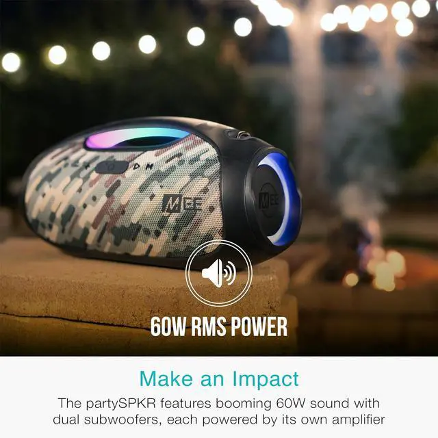 RICH & IMPACTFUL SOUND + 3 AUDIO MODES : With booming 60W RMS stereo sound delivered by a combination of dual tweeters, dual woofers, and dual passive radiators, all powered by dual amplifiers, the partySPKR is perfect for both indoor and outdoor use; 3 audio modes - Dynamic, Bass Boost, and Vocal Boost - let you further tailor the sound to better suit your mood - and your music!