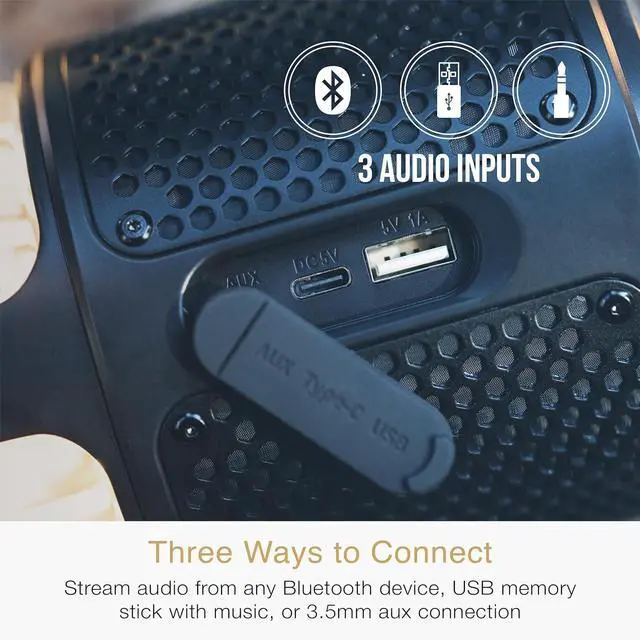 WATER RESISTANCE + MORE : IPX6 weather resistant design for protection from water and moisture, indoors and out; 3 AUDIO INPUTS let you stream audio from any Bluetooth device, USB memory stick with music, or 3.5mm aux connection; BUILT-IN SPEAKERPHONE with mic and Siri/Google Assistant support let you take calls and control your phone right from your lightSPKR; 1-year manufacturer warranty
