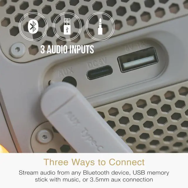 WATER RESISTANCE + MORE: IPX6 weather resistant design for protection from water and moisture, indoors and out; 3 AUDIO INPUTS let you stream audio from any Bluetooth device, USB memory stick with music, or 3.5mm aux connection; BUILT-IN SPEAKERPHONE with mic & Siri/Google Assistant support let you take calls and control your phone right from your lightSPKR; 1-year manufacturer warranty