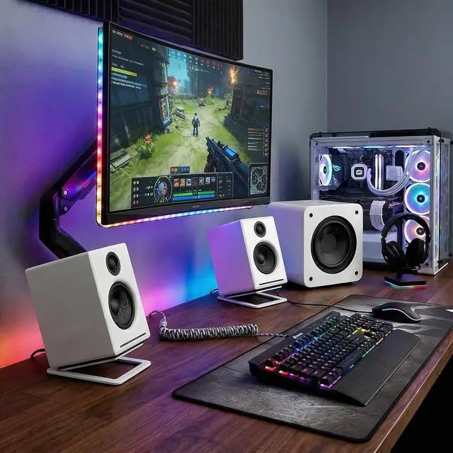 COMPACT SPEAKERS WITH PREMIUM SOUND A2+ Bluetooth computer speakers deliver crisp highs, detailed mids, and rich stereo sound in a compact design ideal for small desks and minimal setups.