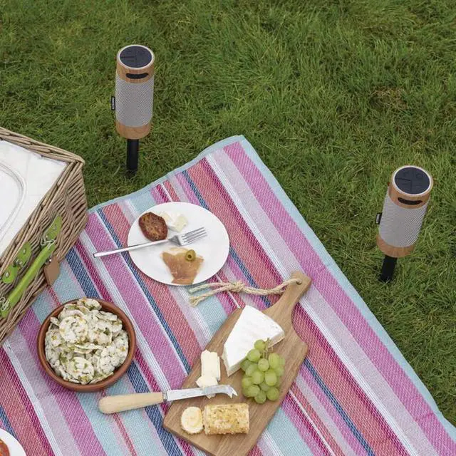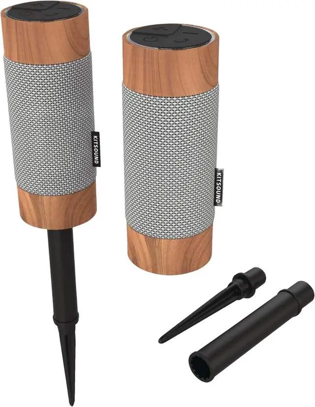 Removable ground stakes keep speakers elevated for clearer sound