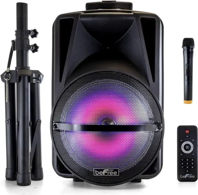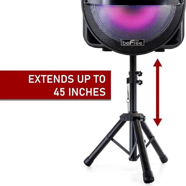 Get the good vibes going with the beFree Sound 12 inch portable part speaker. Bring it to any gathering or social event with its sturdy wheels and extendable handle for easy traveling. This all in one entertainment assistant is perfect for public speakers, motivational speakers, advertisers and DJs as well. With the large variety of outputs, the party never stops! Plug in some RCA cables into your classy stereo system to amplify the sound. Enjoy some AM or FM radio and listen to your favorite shows out loud. Bring a USB flash drive or TF card as a back up music provider. Relax with friends and take turns passing the AUX around to show off newly discovered tracks. Wirelessly run music through the speaker with innovative Bluetooth technology. Don't be restricted by any cables, play straight from of your phone. Whether you're a bass line junkie or a treble head, enjoy your sound the way you want to hear it with bass and treble equalizer knobs. Turn on the party lights and get a rave going as the reactive LED lights put on a show. Comes with a microphone for public speakers and presenters who need their voice to be heard. The 45 inch stand gives you sound a good lift off the ground for better noise. This sound system is suitable for out door events thanks to the rechargeable battery. One full charge can last up to 3 hours. Use the remote to help control sound levels. Move some bodies with the 12 inch woofer and its power punch of sound. Even the wall flowers can enjoy the music from a far!