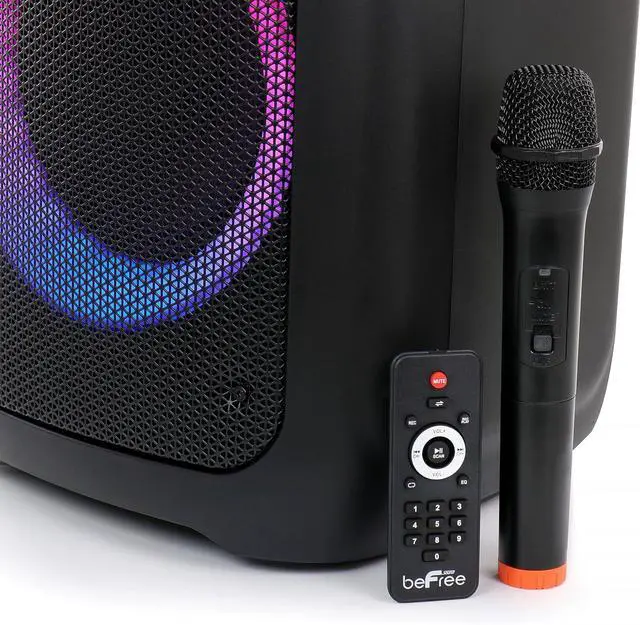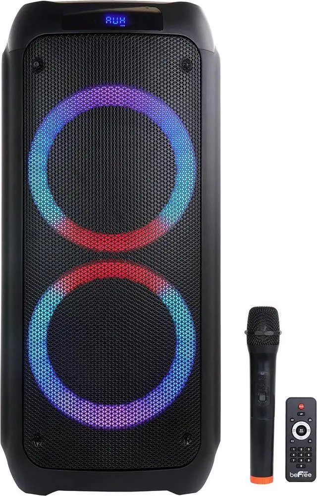 Step into a world of quality sound with the beFree Sound Dual 8 Inch Bluetooth Wireless Portable Party Speaker with Reactive Lights. The ultimate sound machine for all your listening needs. Perfect for all size gatherings indoors and out, boosts great quality sound that will get any crowd moving and grooving. Reactive lights will also entertain your audience with it's multi colored light show. Unit includes a handy wireless microphone to assist in addressing your large crowds along with a remote control allowing you to quickly navigate through the speakers functions. Your carry handle and panel is ideally located at the top of the speaker with adjustable volume and level controls. Connect wirelessly with your smart device or through the card slots with your saved music files.