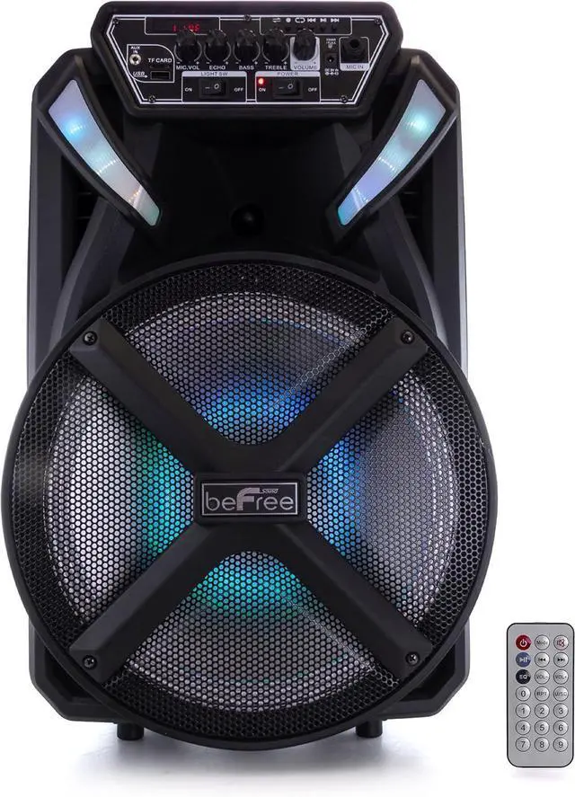 Take the party anywhere with the beFree Sound 12" BT Portable Rechargeable Party Speaker! This 10 lbs. party speaker is fully mobile with rolling wheels and a carrying handle for easy transportation. Not only is this speaker mobile, but this system comes complete with sound reactive lights, USB/TF compatibility, a remote control, and an FM radio for an all in one party experience!