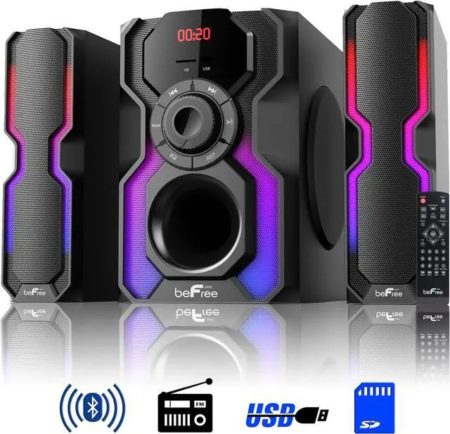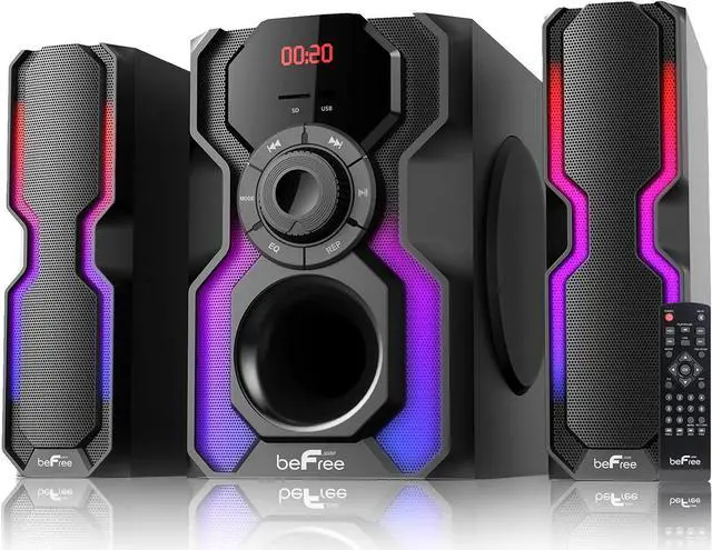 The Hot New beFree Sound 2.1 Channel Multimedia Wired Speaker Shelf System with Sound Reactive LED lights and USB Input offer you and your home an elevated audio experience. With strong, clear and vibrant sound quality this wired shelf system will bring a smile to your face while filling your home or office with the sounds of your favorite tracks. The integrated LED lighting element adds a subtle allure that enhances your visual and audible experience. Alternating light patterns will move along with the sounds of the music to delight your senses and add a special touch to the songs you know and love. This unit comes with a handy remote control for your ease and convenience, and will be a wonderful addition to your favorite musical space. It also makes a stunning gift for your coworkers, family and friends. But should you choose to enjoy your new sound system in the privacy of your own home, you will be delighted with the intimate yet vibrant alternating LED lights, the smooth and clear sound and the modern sleek design of this brand new system. The system includes a main unit sub-woofer with LED lights, as well as 2 LED Lit wired shelf speakers which may be angled to convey the sound to each corner of your musical enjoyment space of choice. Speakers: 6.5" Subwoofer /3" Satellite Speakers (2) Output Power : 80W (50W 15W x 2) Frequency Response : 40Hz-20Khz Impedance: 6 ohm (Subwoofer)/4 ohm (Speakers) S/N Ratio :50dB Separation :75dB Sensitivity :88±3dB Power : 110V, 60 Hz Material : ABS Color : Black & Silver Modes: AUX, BT, FM Radio,USB, SD Accessories: Remote Control (AA batteries not included), Power Adapter, 3.5 mm Audio Cable, LED Speaker Cables LED Satellite Speakers Subwoofer Dimensions : 14.5" x 12.2" x 9.2" Satellite Speakers Dimensions : 14.5" x 3.9" x 3.1"