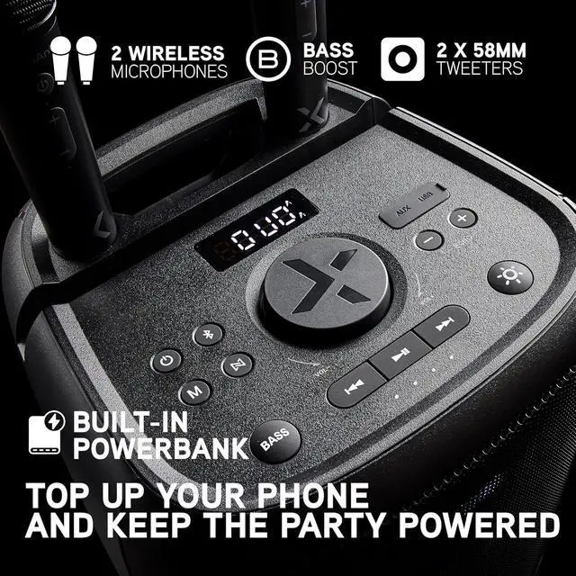 KEY FEATURES - 120 Watts of Pure Party Power, Up to 30 hours play time @ 50% volume, UP to 7 hours play time @ 100% volume, Epic bass at all volume levels, Two Wireless Microphones, Audio driven lightshow with 7 modes, IP54 Splashproof, 165mm Bass driver, 58mm*2 Tweeters, Bass Reflex Tube, Bass Boost Button, Duo mode for connecting two speakers, Built-in Phone/Tablet holder, BT5.4, USB disk playback, AUX playback, Powerbank, Portable and powerful, just 4.8kg, Built-in battery 20800mAh, AC charging,