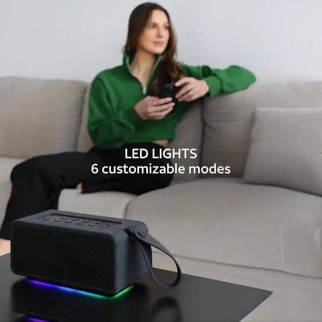 Dynamic Sound & Light Experience: TWS stereo pairing and 6 LED light modes create an immersive audiovisual environment.