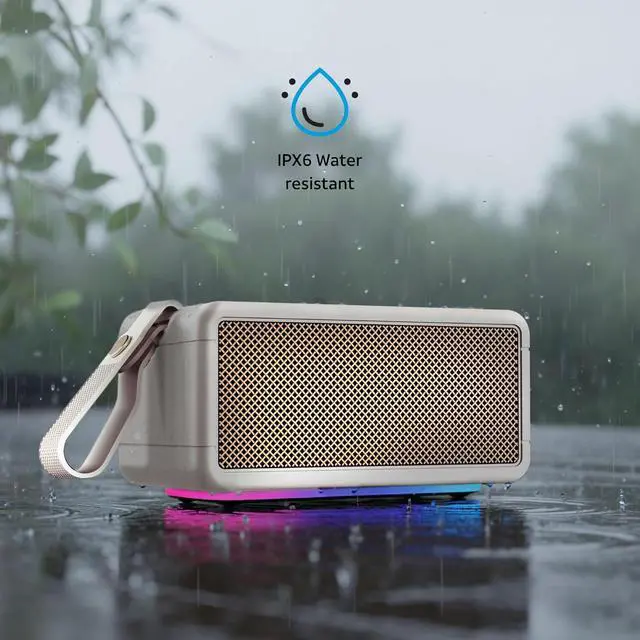 Speaker40W dual-driver with tuned DSP/EQBattery LifeUp to 12 hours per chargeCharging PortUSB-C (cable included)ConnectivityBluetooth 5.3 wirelessWater ProtectionIPX6 (splash-resistant)Stereo PairingTrue Wireless Stereo (TWS)Materials/FinishRetro cream and black, textured grilleCompatibilityiOS/Android devices, laptops, tablets, TVs (Bluetooth) Elevate Your Listening with This 40W Powerhouse