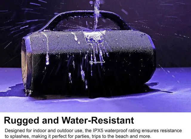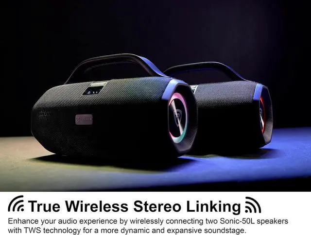 Take the SONIC-50L anywhere, rain or shine. With an IPX5 water-resistance rating, this Bluetooth speaker is built to withstand splashes and spills, making it ideal for outdoor adventures, beach trips, or poolside parties.