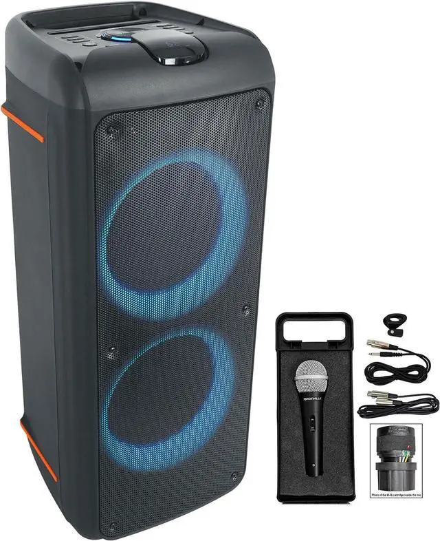 PACKAGE INCLUDES: (1) Rockville ROCK PARTY 9 Dual 8"" Home/Portable Bluetooth Speaker Deep Bass+Effects, (1) Rockville RMC-XLR High-End Metal DJ Handheld Wired Microphone Mic w (2) Cables