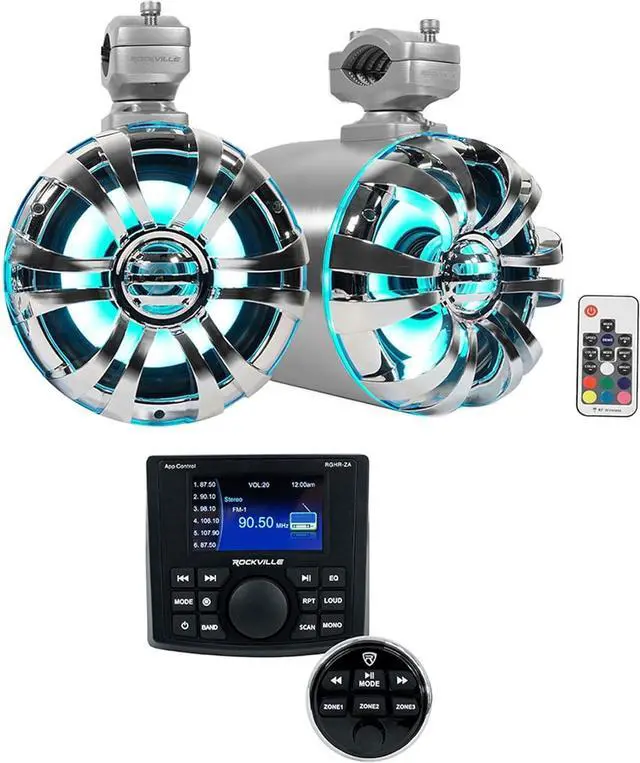 Package Includes: (1) Rockville RGHR-ZA 4 Zone Marine Gauge Hole Receiver Bluetooth App Control + Remote, (1) Pair Rockville WB65KLED 6.5" 600-Watt Metal Marine Wakeboard LED Tower Speakers + Remote