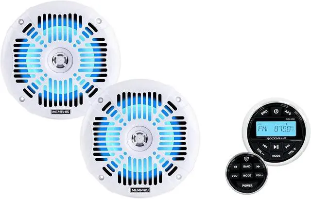 • Package Includes: (1) Rockville RGHR2 Marine Gauge Hole Receiver w Bluetooth USB, Radio + Wired Remote. (1) Pair Memphis Audio MXA602SLW 80w 6.5" LED Speakers For Polaris RZR/ATV/UTV/Cart