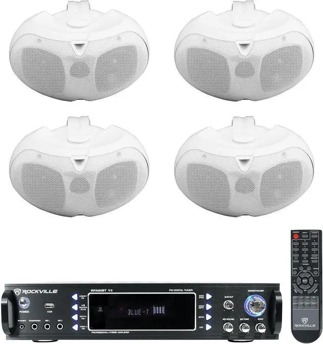 Package Includes: (1) Rockville RPA60BT V2 1000 Watt 2-Ch USB Bluetooth DJ/Pro/Karaoke Amplifier Mixer, (4) Rockville D4-16 White Dual 4 in 16 Ohm Swivel Outdoor Home Patio Speakers.