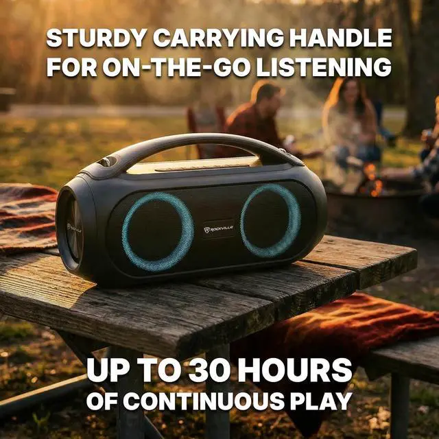 DESIGNED FOR ADVENTURE: Rugged build with carry handle, strap hooks, and IPX5 water resistance makes it ideal for the beach, camping, and more.