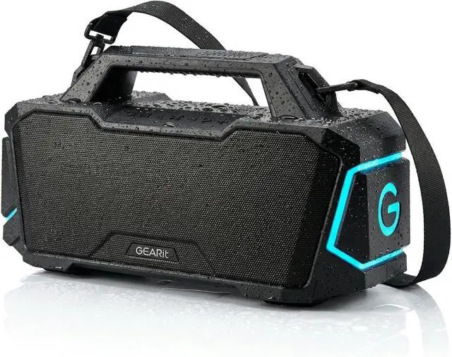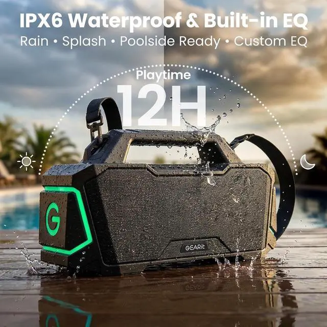 Built-in EQ & IPX6 Waterproof & RGB Lighting: GEARit Portable Speaker is built-in EQ that let you customize sound: Bass Boost, Treble Boost, Vocal Mode, or custom EQ for total control. IPX6 waterproof withstands heavy splashes, rain, and beach spray,perfect for poolside, camping, or unexpected weather. Dynamic RGB lighting sets the mood with multiple color modes.