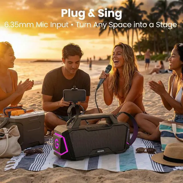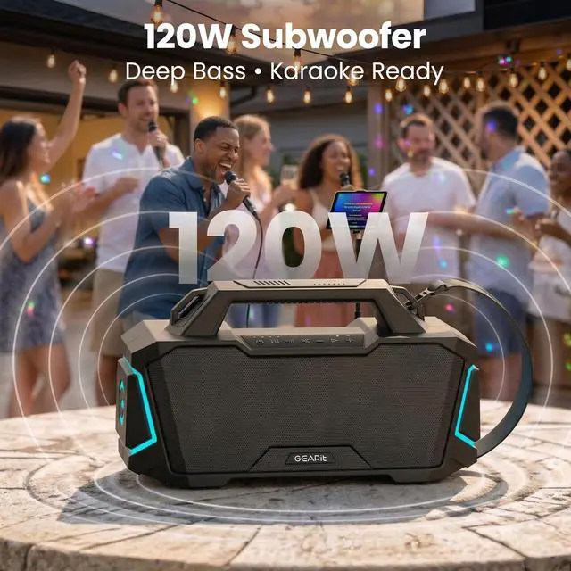 120W Subwoofer with Deepest Bass & Karaoke:Experience the ultimate outdoor audio with 120 watts power and a dedicated subwoofer that delivers deep, punchy bass you can feel. Whether you're hosting a beach party, camping under the stars, or tailgating with friends, GEARit Boombox Outdoor Speaker fills any open space with room-filling sound that keeps the energy high. Plus, built-in karaoke function lets you plug in a microphone (not included) and sing along to your favorite tracks ¡ª turning any gathering into a live concert.