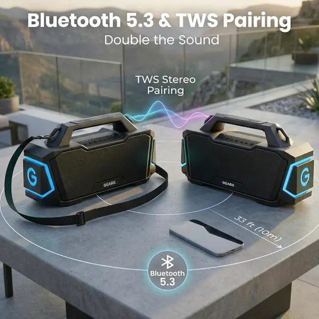 12H Playtime & Bluetooth 5.3 & TWS Pairing: Enjoy up to 12 hours of continuous playtime on a single charge, enough for a full day at the beach or an entire night of partying. Powered by Bluetooth 5.3 technology, experience faster pairing, stable connection, and extended range up to 33 feet. Want even bigger sound? TWS pairing lets you connect two speakers for immersive left-right stereo sound that fills any space.