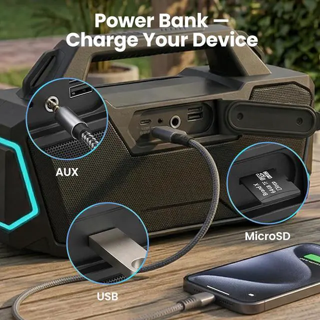 AUX/MicroSD/USB & Power Bank & Mic Input: Enjoy total flexibility with multiple playback options: Microphone Input (6.35mm): Plug in a wired microphone for karaoke sessions; AUX Input: Connect TVs, laptops, or MP3 players for backing tracks; USB Drive: Plug and play MP3 files directly with karaoke tracks; MicroSD Card: Load your favorite karaoke playlists. Perfect for camping trips, beach days.