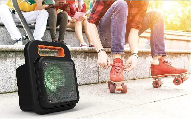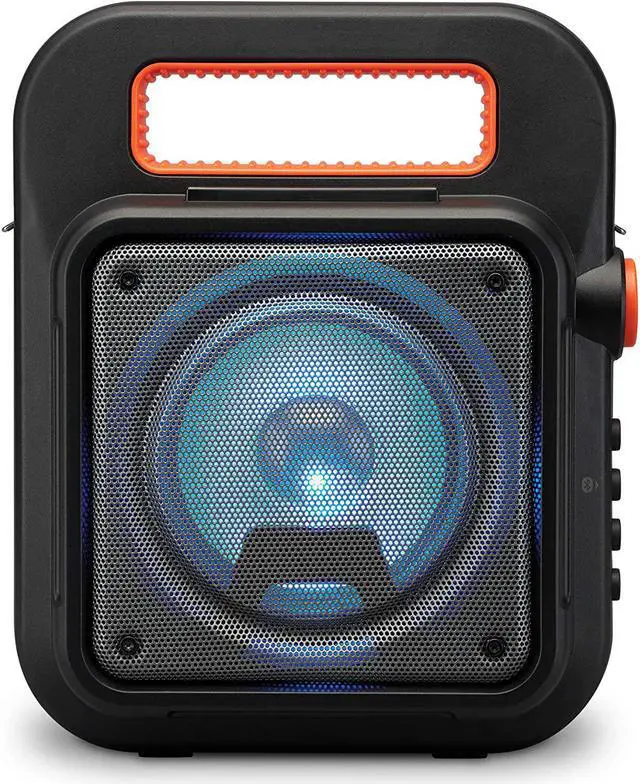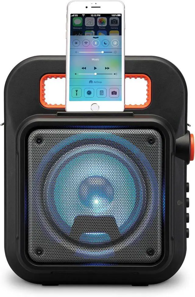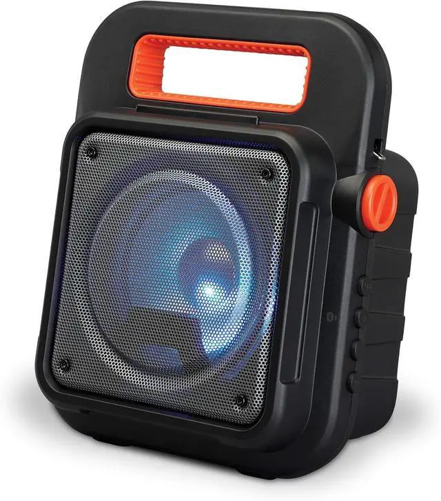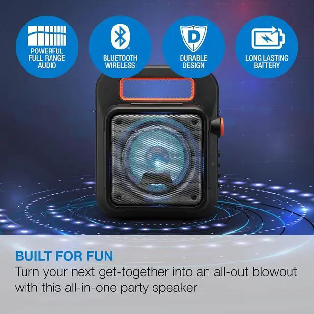 Play/pause/pairing/LED lights button and carry handle for easy portability