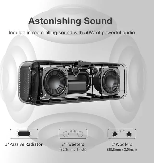 50W Superior Sound: Enjoy exceptional, well-balanced sound as this speaker features dual 3.5-inch woofers, dual 1-inch tweeters, and a passive radiator. Immerse yourself in dynamic and crystal-clear details from your audio.