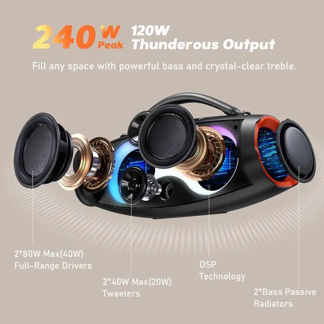 120W Room-Shaking Sound (240Peak): Dual 40W full-range drivers, twin 20W tweeters, dual passive radiators, and advanced DSP technology pump out 120W of powerful soundwith rich mids, punchy lows, and crystal-clear highs, all with minimal distortion. Enjoy clean, room-filling audio that's perfect for large living rooms, backyards, and outdoor gatherings. Great for parties, movie nights, BBQs, background tunes in the kitchen, or soundtracking your workshop.