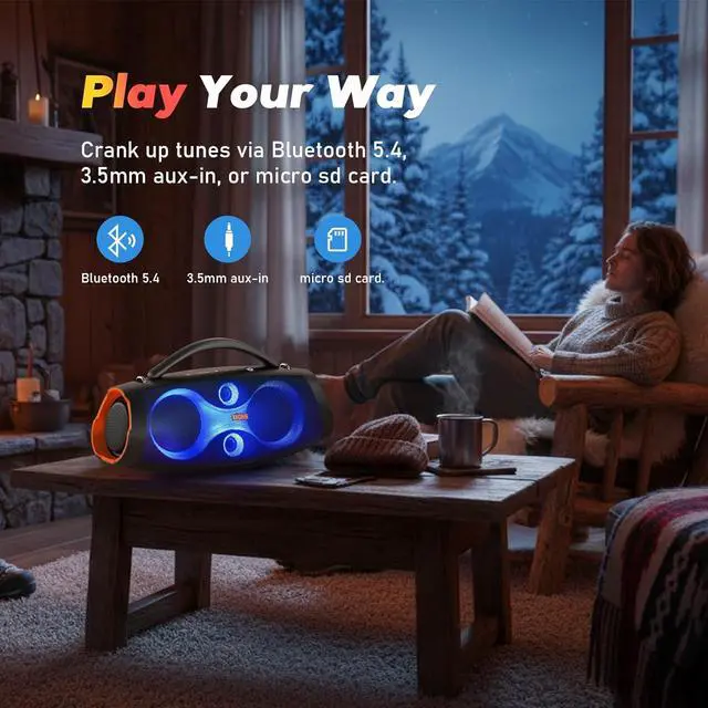 Bluetooth 5.4: Bluetooth 5.4 technology ensures a fast and stable connection with your preferred devices, allowing you to stream your playlist seamlessly from up to 82 feet away. Additionally, you can enjoy music through an Aux-in cable (not included), or a TF card (not provided).