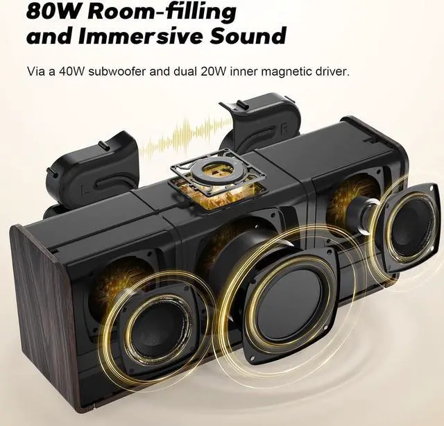 80W Impressive Sound: Delight in high-quality, room-filling sound with our speaker's 40W subwoofer, dual 20W inner magnet driver drivers, and dual DSP technologies. Immerse yourself in rich bass with vivid detail, perfect for enhancing your home entertainment experience with this 2.1 sound channel system.