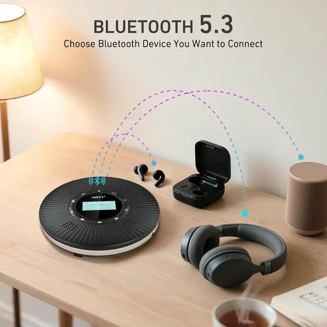 Upgraded 5.3 Bluetooth & Optional Bluetooth ListThe CD player for home adopts the built-in 5.3 Bluetooth, which can connect Bluetooth speakers or Bluetooth headphones more stably to play music or audio books,And the discman cd player is also equipped with an optional Bluetooth list function to help you display the names of Bluetooth devices, so that you can connect to the devices you need more accurately and clearly