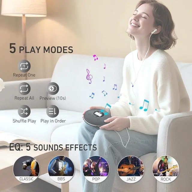 Professional Protable CD PlayerHOTT originated in 1999 and is committed to providing high-quality CD players for music lovers. This portable CD player is perfect for playing your precious CDs. It is widely compatible with CD format: CD, MP3, CD-RW, CD-R and audio formats: WMA,MP3,CD-DA. (DVD is not supported). Five sound effects are provided: BBS, pop, jazz, rock and classical. Portable CD players provides you with high-restored pure sound quality, so that you can easily enjoy wonderful music