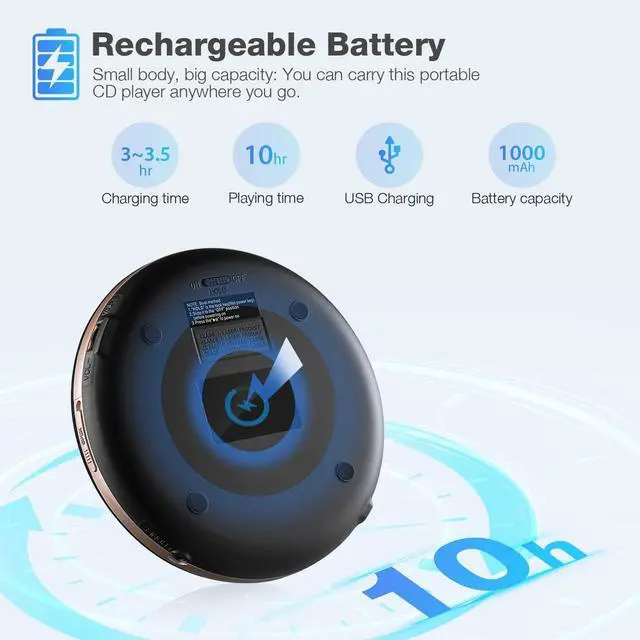 Rechargeable Battery: The HOTT Bluetooth CD player comes with 1000mAh Li-ion battery providing power for 7 hours at medium volume after 3-hoursfully charged. Charging with the USB cable. Does not need AA battery or external power source anymore.