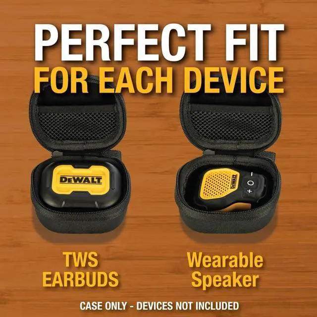 All-in-One Audio Protection: Hard EVA case fits DEWALT speaker or earbuds (one at a time), featuring a soft interior, mesh pocket, and compact, portable design.
