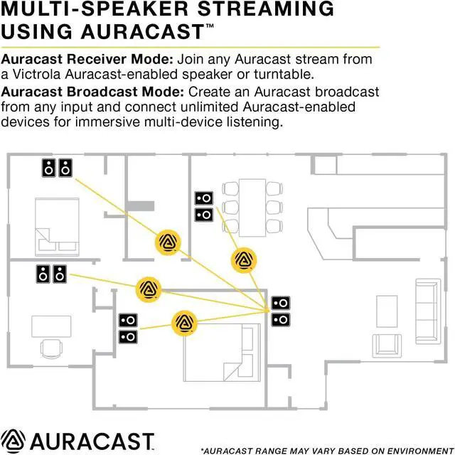 MULTI-SPEAKER STREAMING USING AURACAST Stream audio from a Victrola Auracast broadcast or broadcast any connected audio source wirelessly to compatible Auracast-enabled Victrola products, creating a seamless multi-device listening experience
