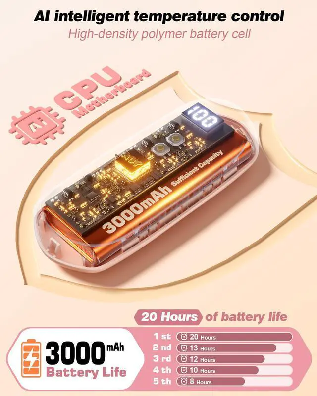 Stay cozy anywhere, anytime with our 2-in-1 Rechargeable Hand Warmers. Each lightweight unit features a 3000mAh battery, 5 adjustable heat levels, and an exclusive 1-second instant heating technology, reaching up to 131°F for ultimate comfort.