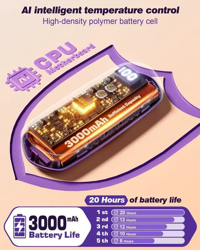 Stay cozy anywhere, anytime with our 2-in-1 Rechargeable Hand Warmers. Each lightweight unit features a 3000mAh battery, 5 adjustable heat levels, and an exclusive 1-second instant heating technology, reaching up to 131°F for ultimate comfort.