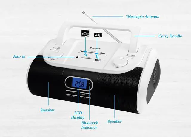 Portable AM/FM Radio, Bluetooth, USB/SD Slot for MP3 Playback, Aux-in, LCD Display, AC/DC Dual Power Source.